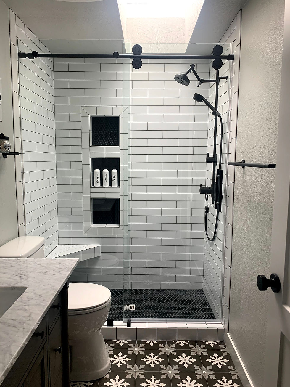 Three growing teenagers needed more space and functionality. A dated bathtub was removed, allowing for a spacious walk-in shower with barn door. The shower fixtures were plumbed to the opposite wall to create a balanced aesthetic and improved access. Matte black hardware and matte white 3x12 subway prove to be very forgiving materials perfect for hiding the inevitable water spots left behind from hasty showers. This bathroom was built to withstand the teenage years, yet remains a timeless design for future overnight guests long after the kids have flown the nest.